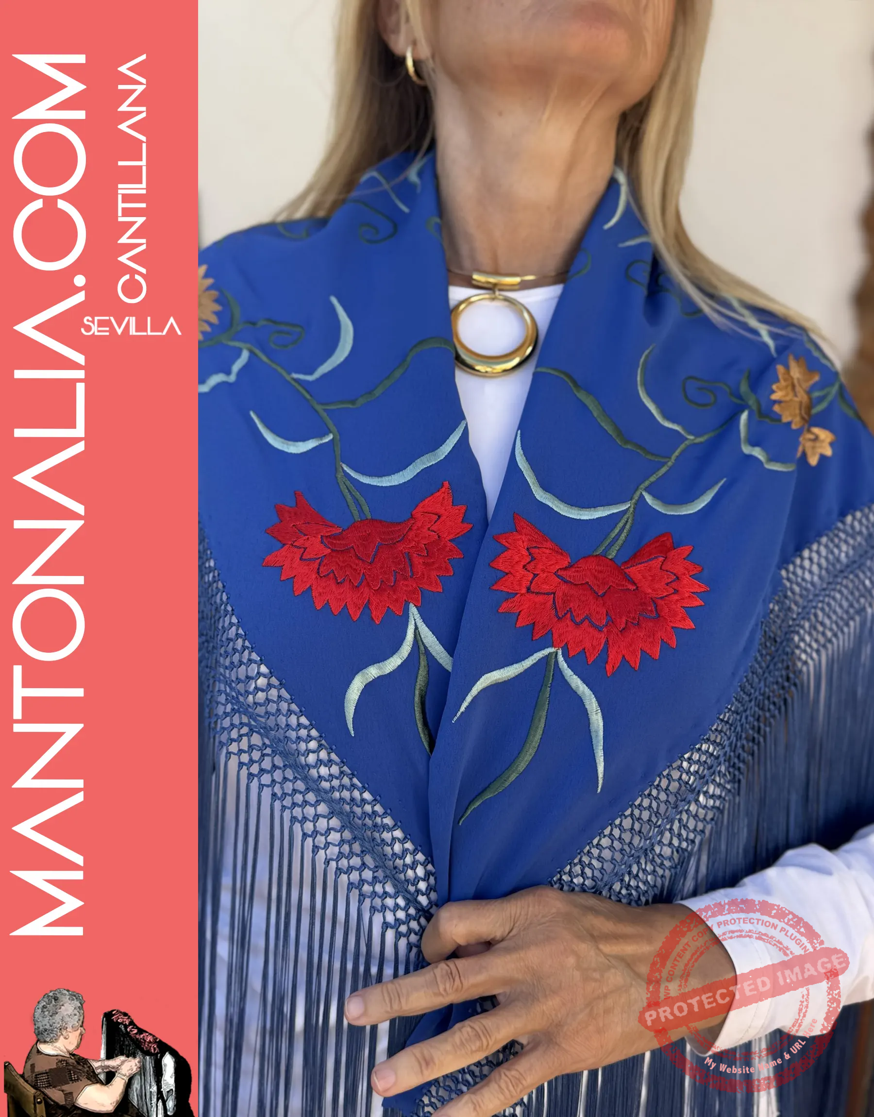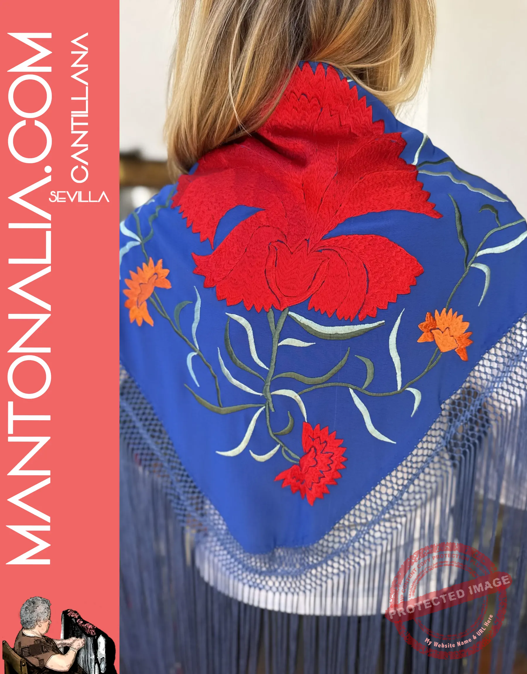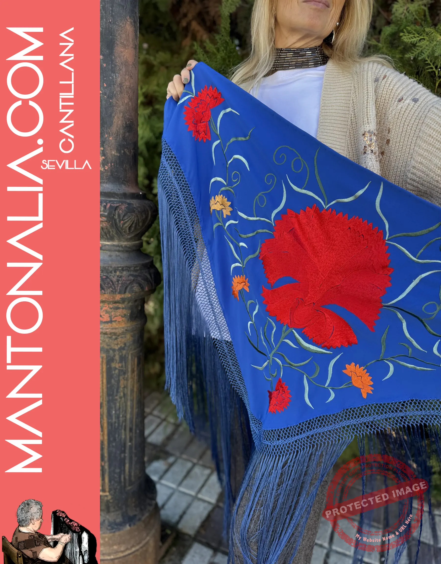 Resalta tu estilo con la fuerza del Mantón Clavellina, una pieza única confeccionada en crespón de seda de color azul añil. Este mantón destaca por su vibrante bordado de claveles en rojo y una gama de colores que aportan un contraste floral clásico y elegante.