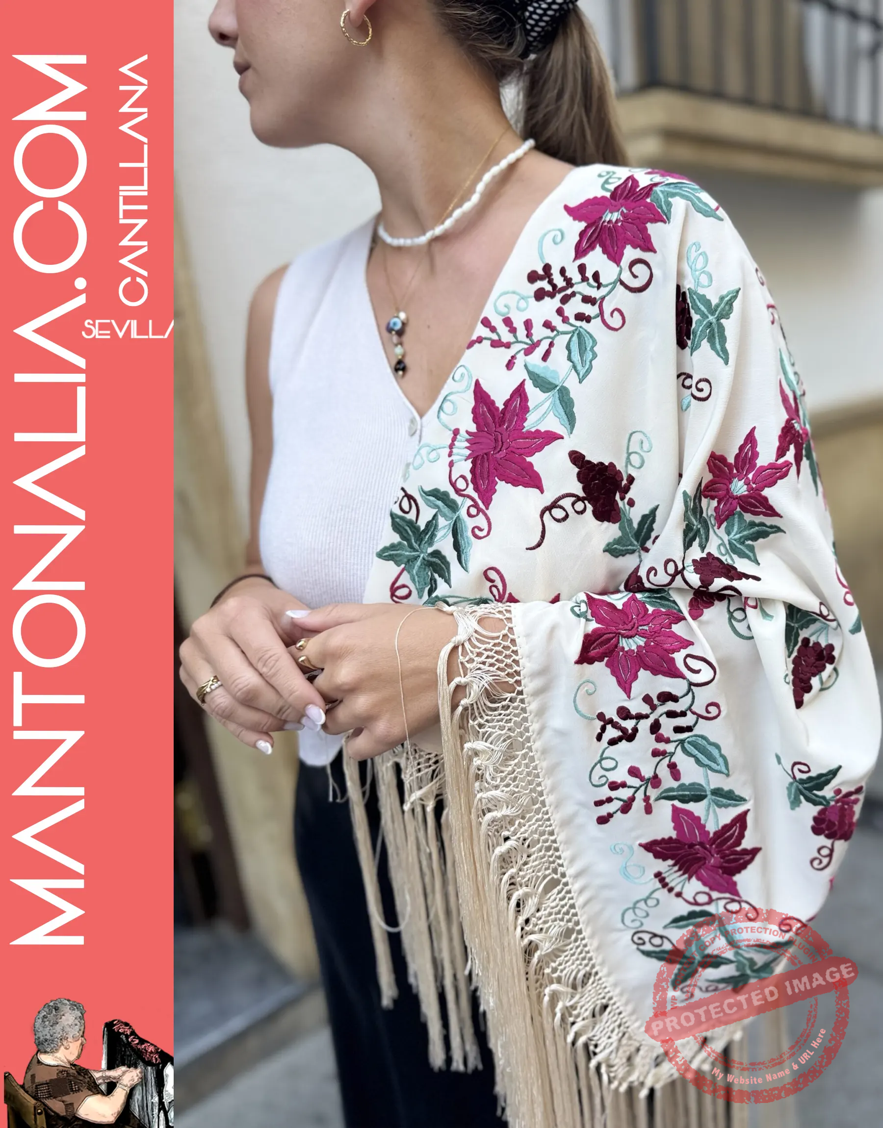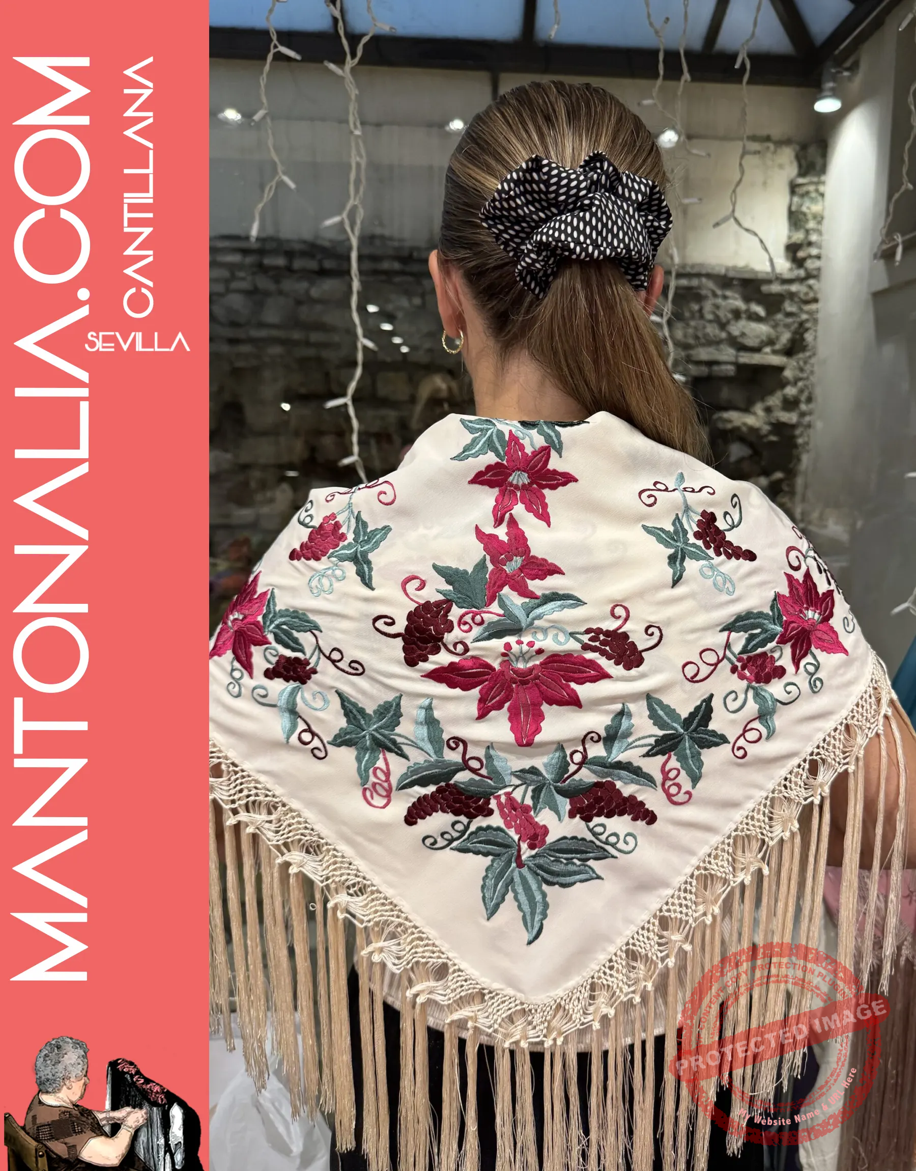 Consigue nuestro mantón cuadrado de 80×80 cm con bordado exclusivo de racimos de uvas de nuestra firma. Úsalo como mantoncillo de flamenca o chal para eventos. ¡Artesanía única y versátil!