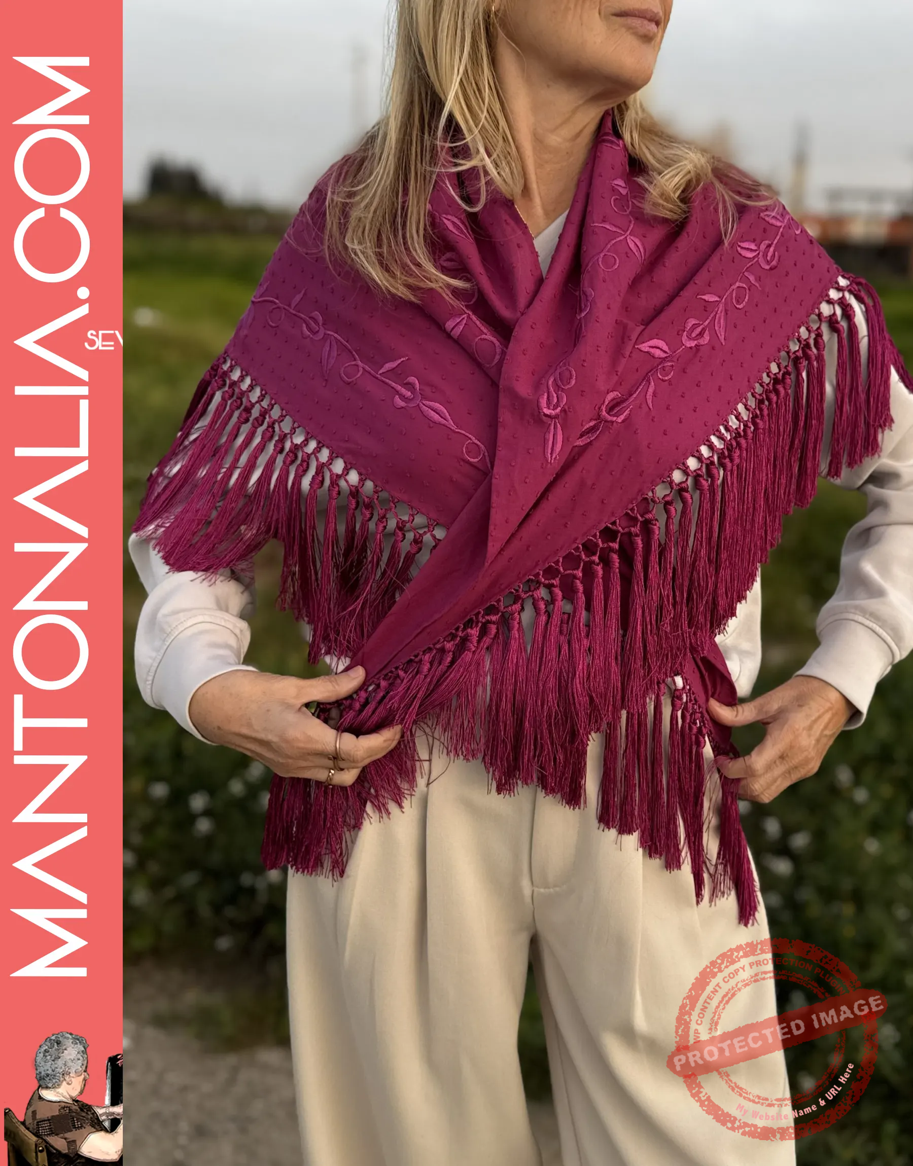 Consigue nuestro mantón cuadrado de 80×80 cm con bordado exclusivo de racimos de uvas de nuestra firma. Úsalo como mantoncillo de flamenca o chal para eventos. ¡Artesanía única y versátil!