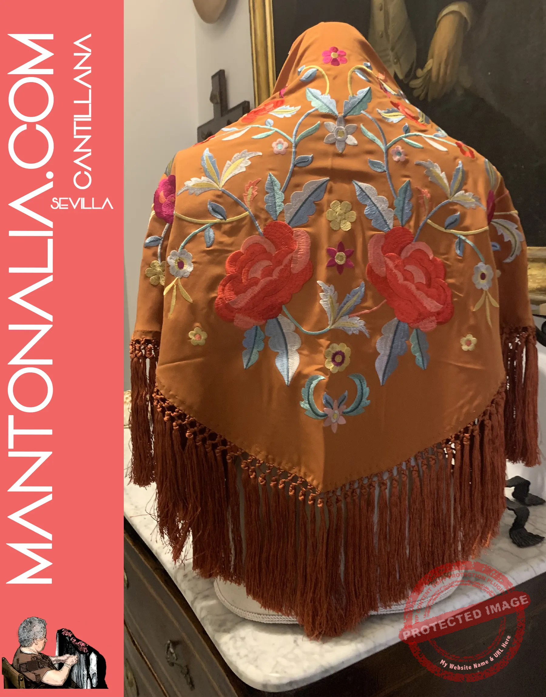 Mantón Flamenco de Crespón Bordado en Seda Camel con Motivos Florales – Hecho a Mano en Cantillana