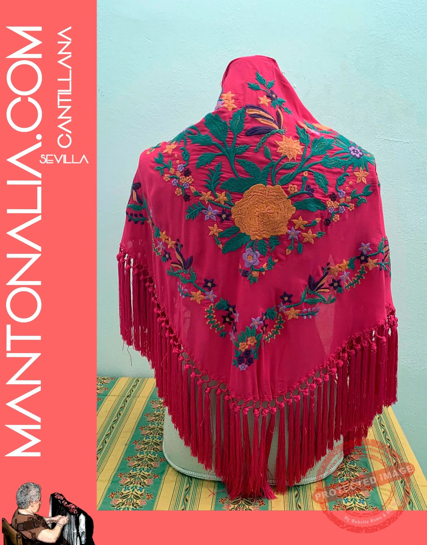 Este mantón flamenco buganvilla, bordado en seda sobre viscosa y algodón, combina tradición y elegancia. Hecho a mano en Cantillana, presenta motivos florales.