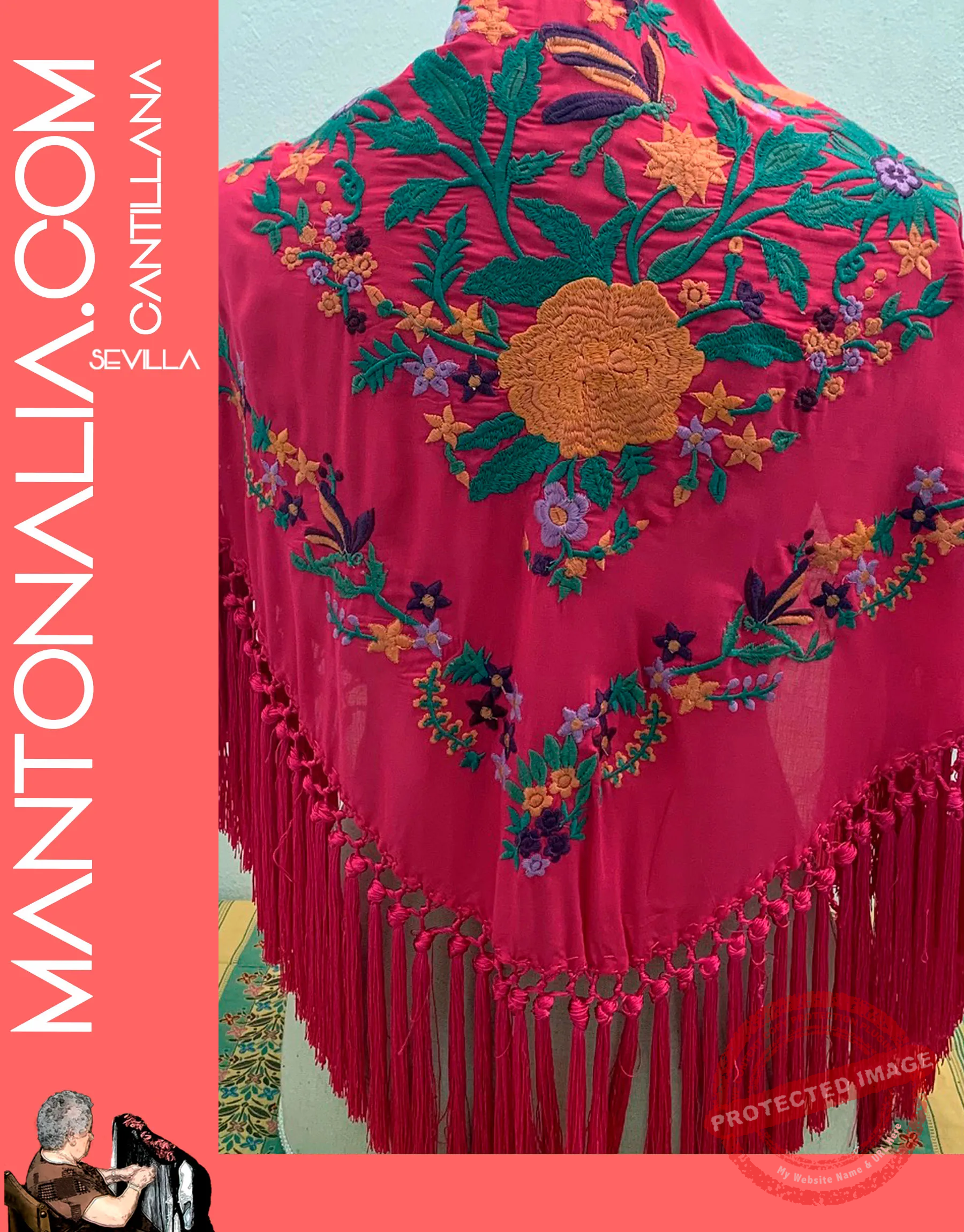 Este mantón flamenco fucsia, bordado en seda sobre viscosa y algodón, combina tradición y elegancia. Hecho a mano en Cantillana, presenta motivos florales.