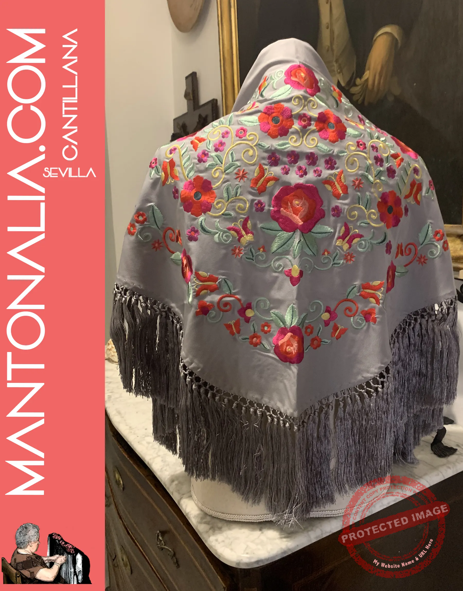 Este mantón flamenco Gris, bordado en seda sobre crespón, combina tradición y elegancia. Hecho a mano en Cantillana, presenta motivos florales.