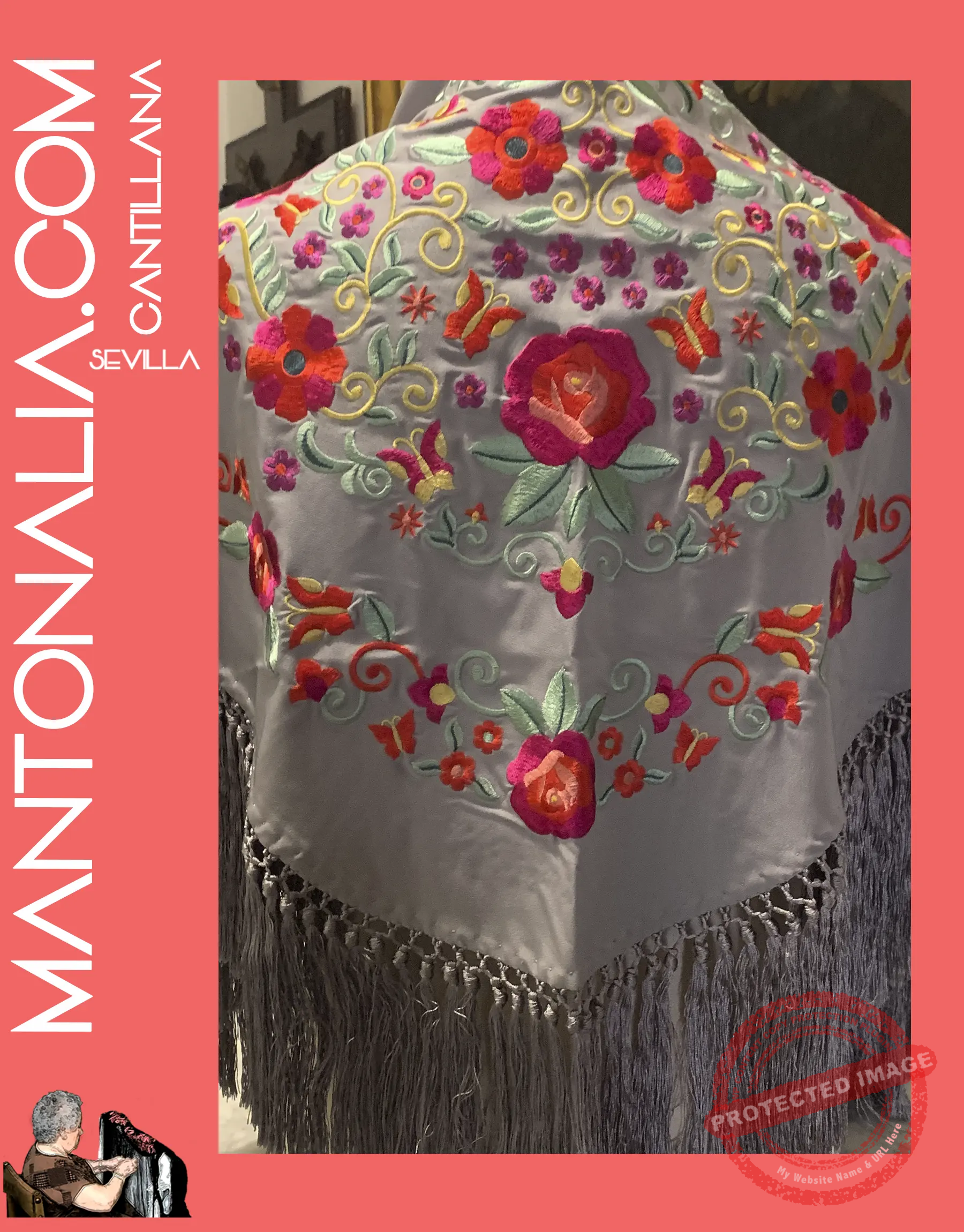 Hecho a mano en Cantillana, cuna de la tradición flamenca, este mantón destaca por su artesanía y calidad de los materiales. Las medidas aproximadas son de 140 cm de ancho y 40 cm de alto, con un enrejado de 2 cm que resalta aún más la belleza de los bordados, y unos flecos de 15 cm que aportan movimiento y elegancia.