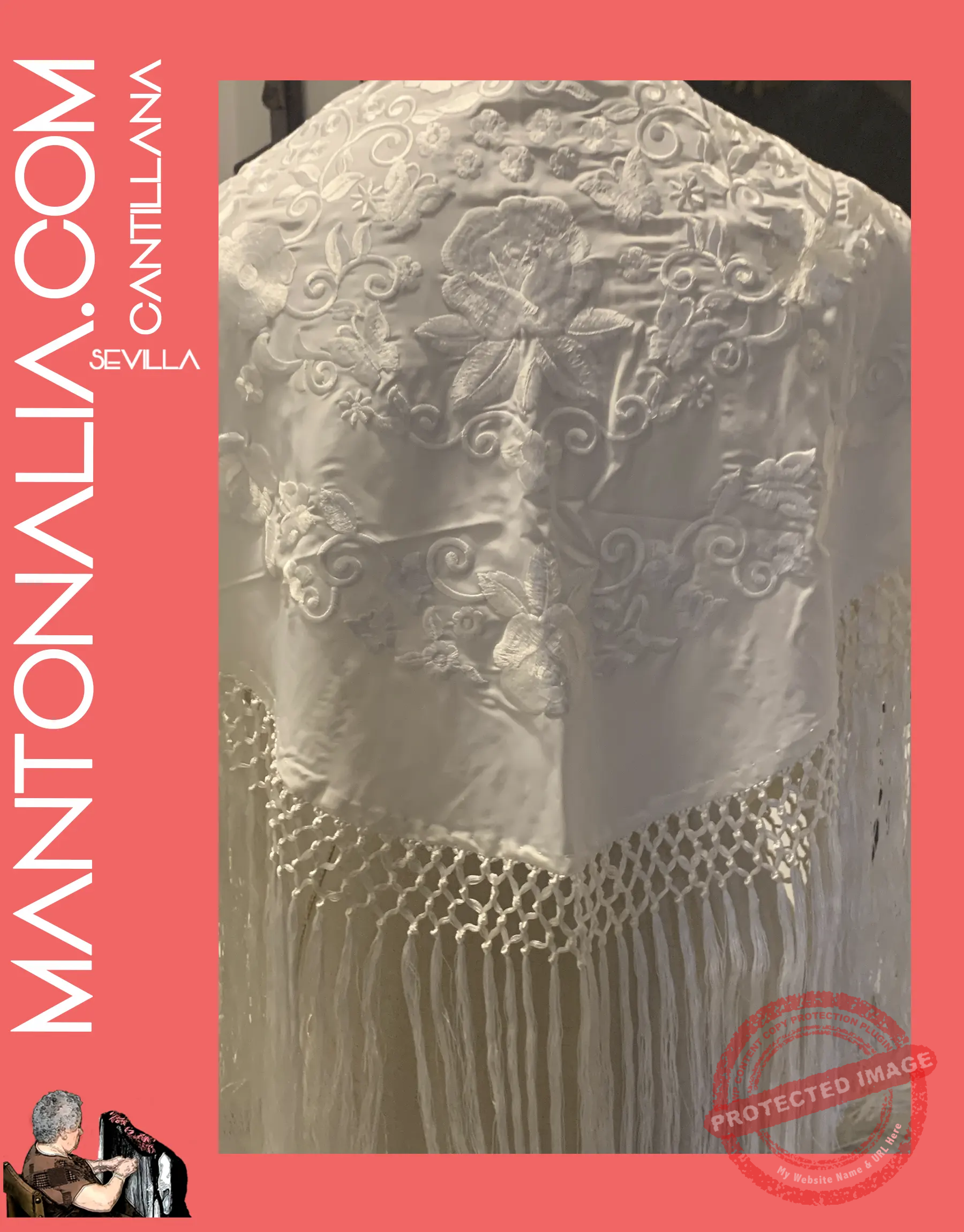 Hecho a mano en Cantillana, cuna de la tradición flamenca, este mantón destaca por su artesanía y calidad de los materiales. Las medidas aproximadas son de 140 cm de ancho y 40 cm de alto, con un enrejado de 2 cm que resalta aún más la belleza de los bordados, y unos flecos de 15 cm que aportan movimiento y elegancia.