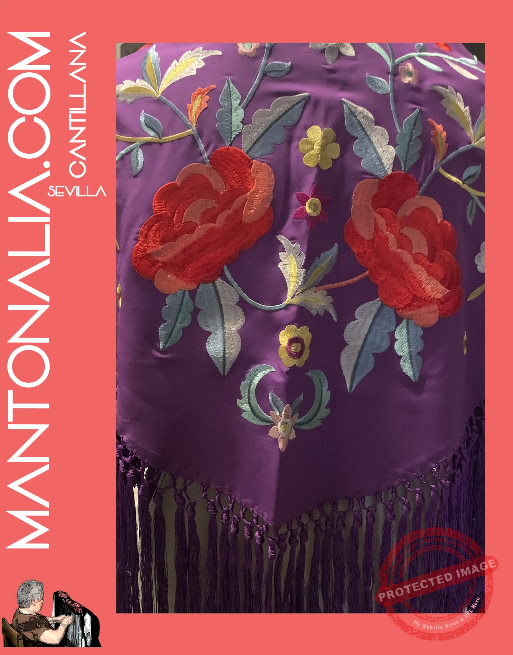 Este mantón flamenco Morado, bordado en seda sobre crespón, combina tradición y elegancia. Hecho a mano en Cantillana, presenta motivos florales.