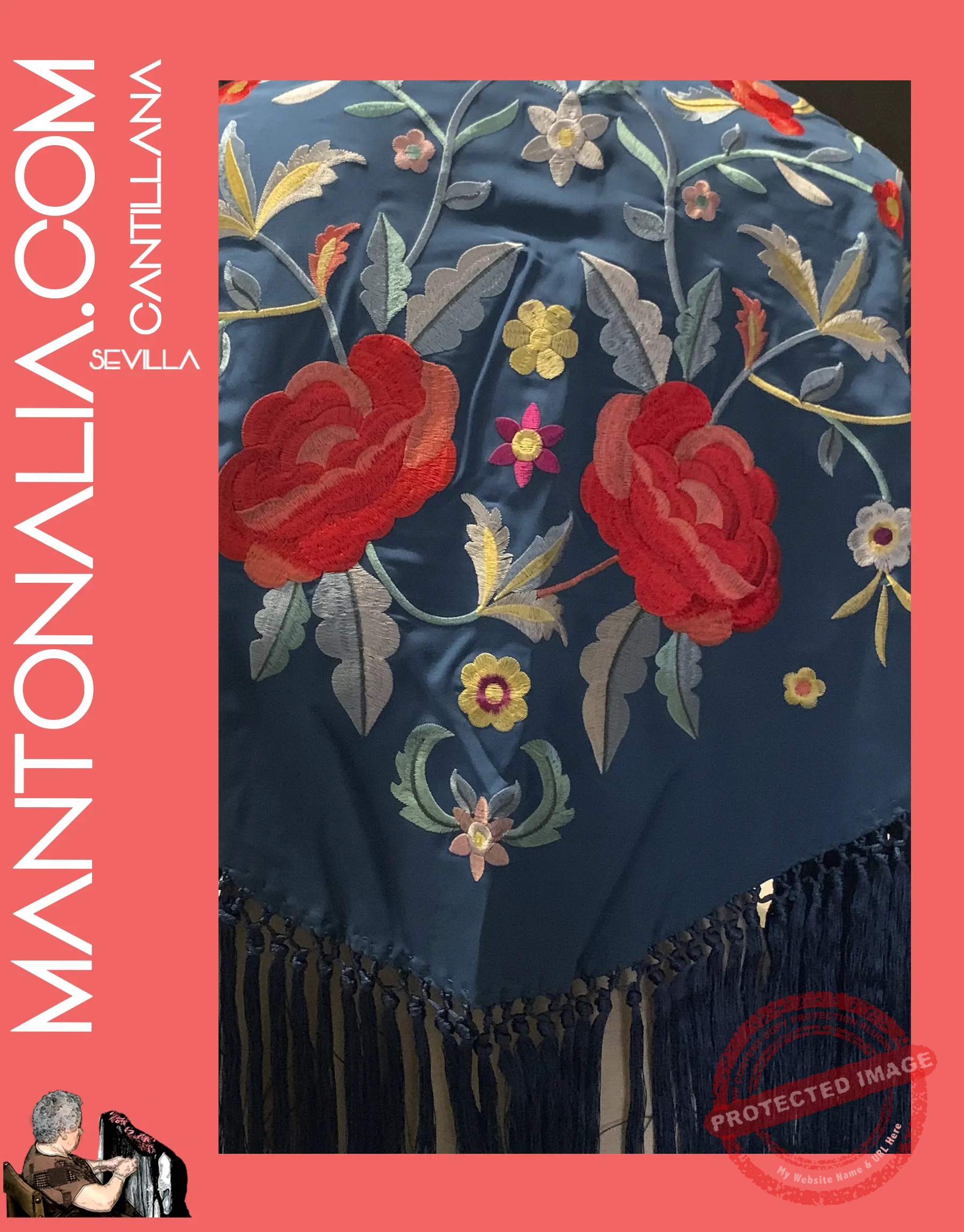 Mantón Flamenco de Crespón Bordado en Seda Petroleo con Motivos Florales – Hecho a Mano en Cantillana