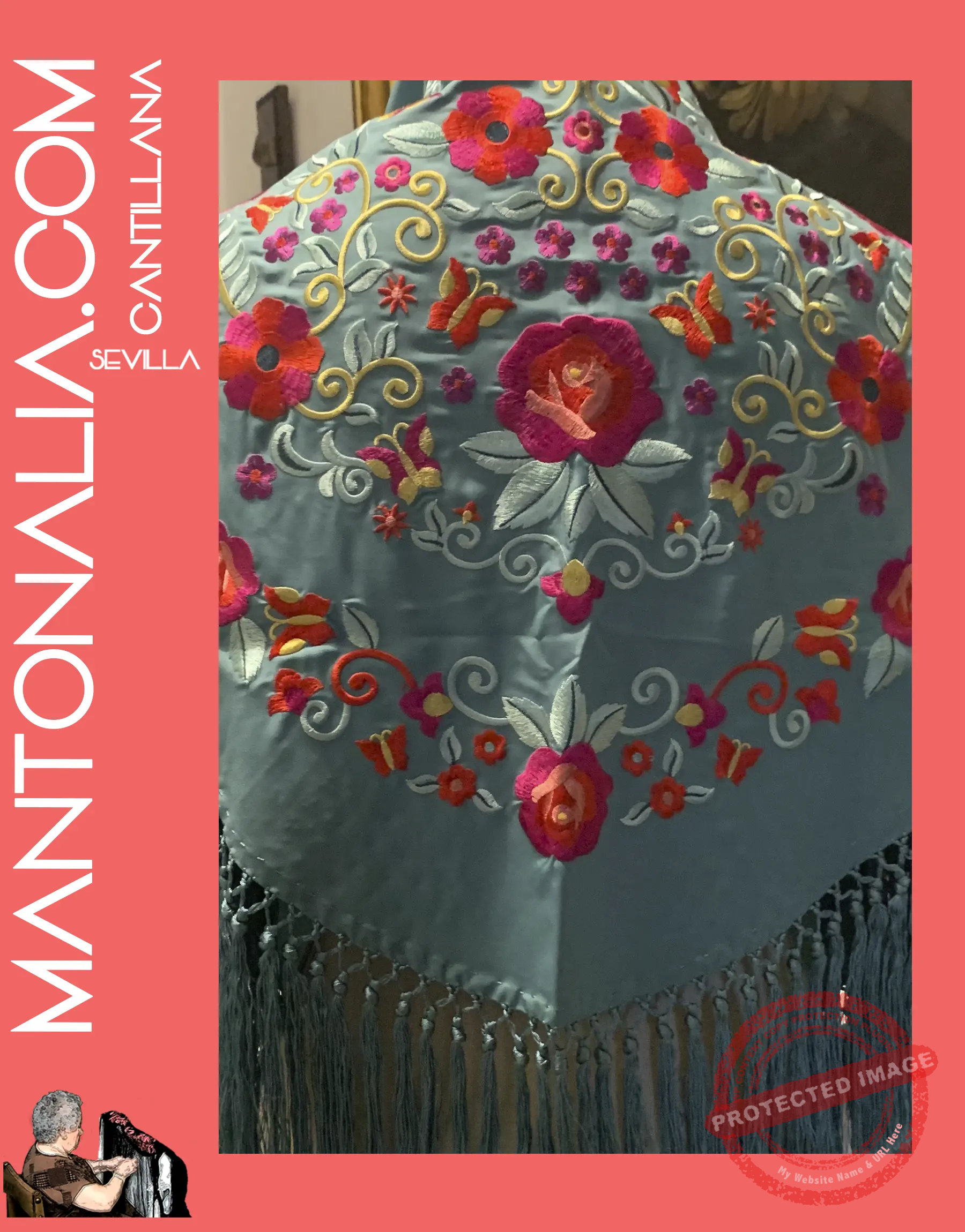 Este exquisito mantón flamenco combina la suavidad de crespón, con el toque elegante de un bordado en seda de alta calidad. Su vibrante color Petroleo resalta entre los colores tradicionales, ofreciendo un estilo moderno pero fiel a la esencia del arte flamenco. Los motivos florales le dan un toque delicado y refinado, mientras que su enrejado terminado en borlón lo convierte en una pieza única, ideal para ferias.