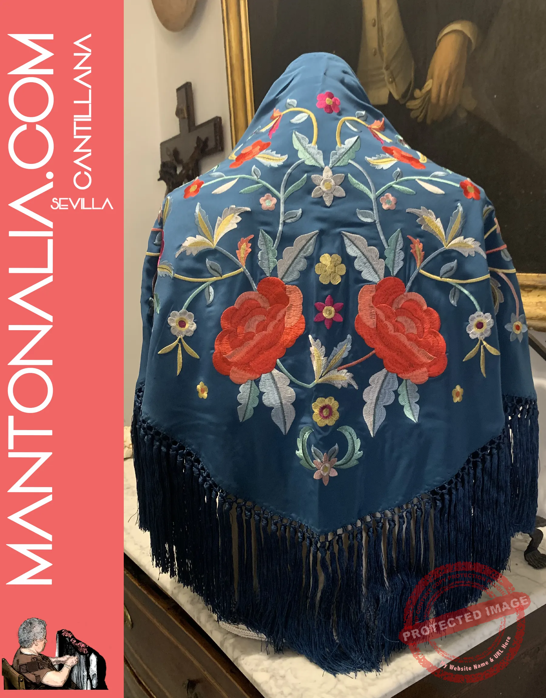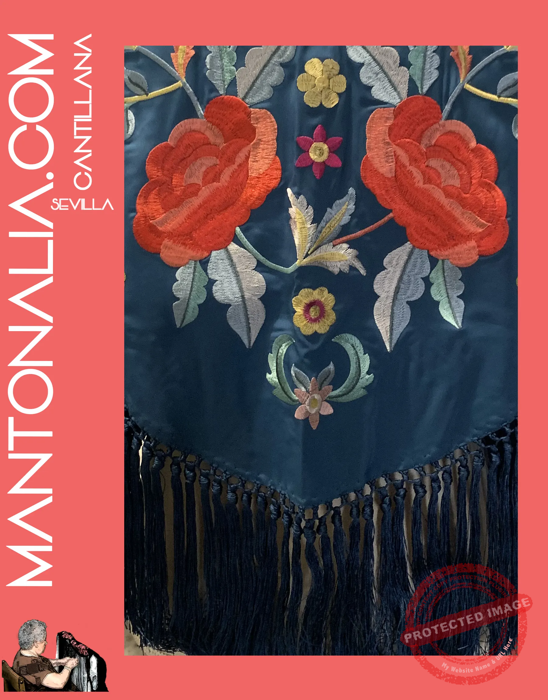 Hecho a mano en Cantillana, cuna de la tradición flamenca, este mantón destaca por su artesanía y calidad de los materiales. Las medidas aproximadas son de 140 cm de ancho y 40 cm de alto, con un enrejado de 2 cm que resalta aún más la belleza de los bordados, y unos flecos de 15 cm que aportan movimiento y elegancia.