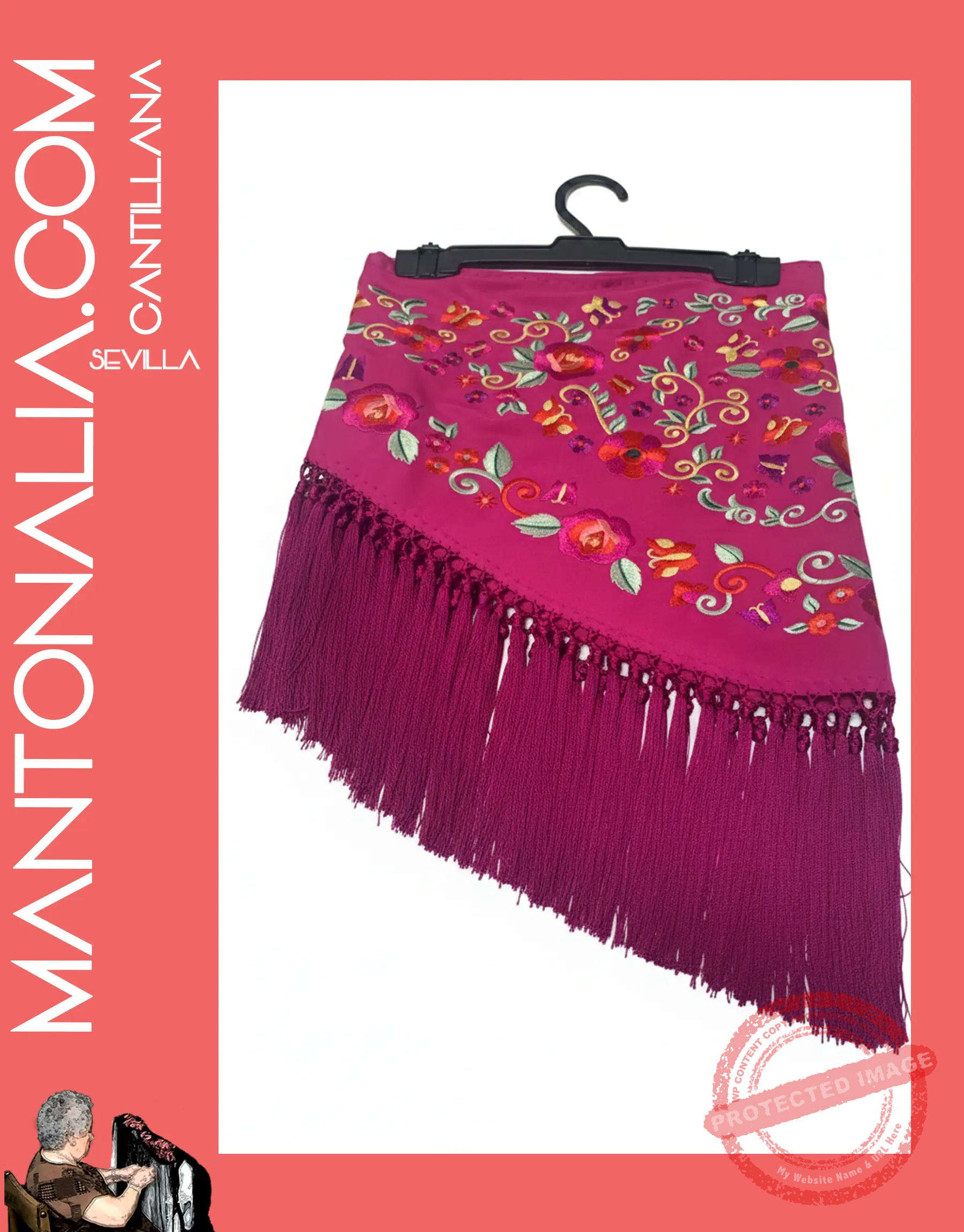 Dale vida a tu traje de flamenca con este mantoncillo de crespón en color Buganvilla. Un diseño clásico con bordados de flores, rematado con flecos de alta calidad que aportan un movimiento espectacular al bailar. Ideal para ferias y romerías que buscan un toque de elegancia artesanal.