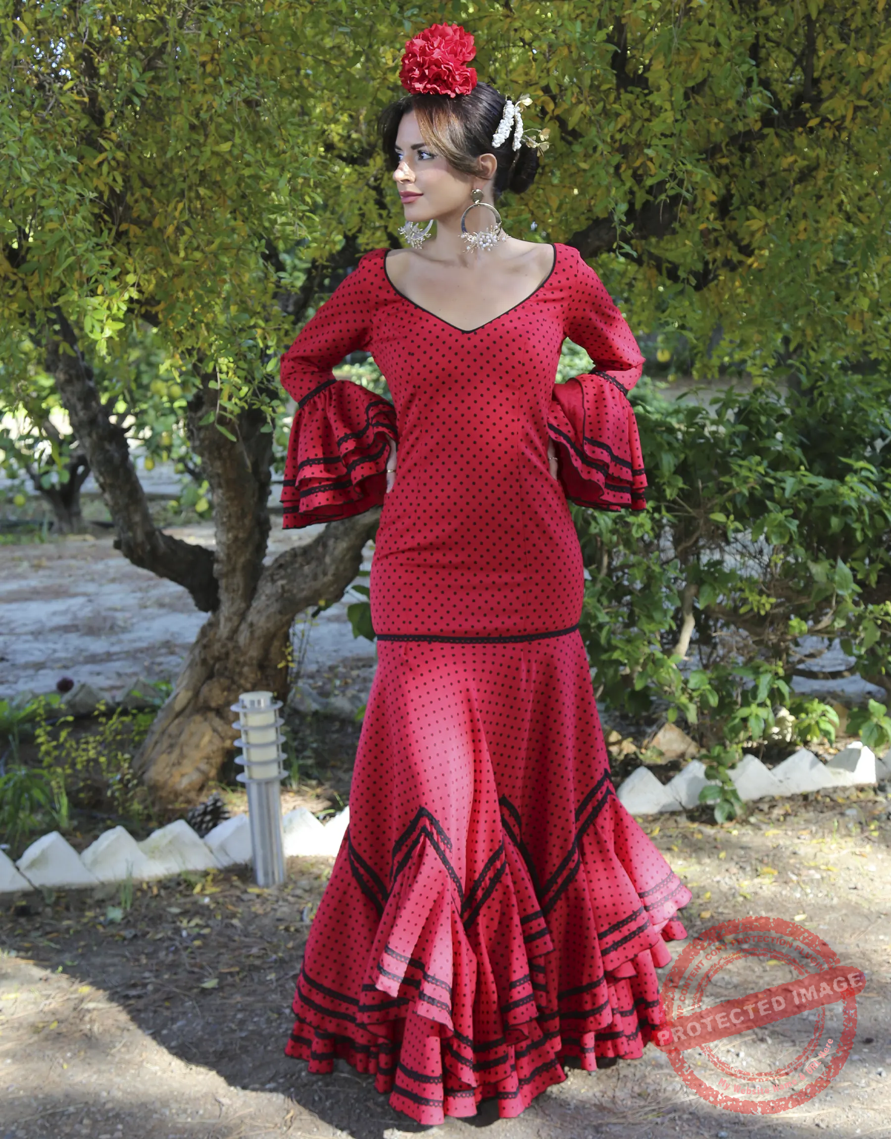 Descubre la esencia de la moda flamenca con el espectacular Traje de Flamenca Jerez, un diseño clásico y sofisticado que destaca por su elegancia y fuerza andaluza. Confeccionado en un vibrante tono rojo pasión con lunares negros, este modelo es ideal para ferias, romerías y eventos flamencos donde quieras brillar con estilo propio.