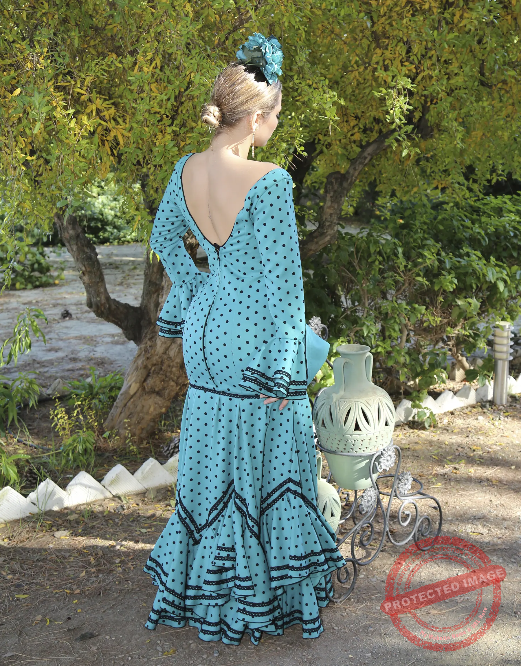 Su favorecedor escote en pico estiliza la figura, mientras que las mangas largas con volantes amplios aportan un toque tradicional lleno de movimiento. El traje se ajusta perfectamente al cuerpo hasta la cadera, realzando la silueta femenina, y se completa con una impresionante falda de volantes escalonados, decorada con ribetes negros que crean un contraste elegante y muy flamenco.
